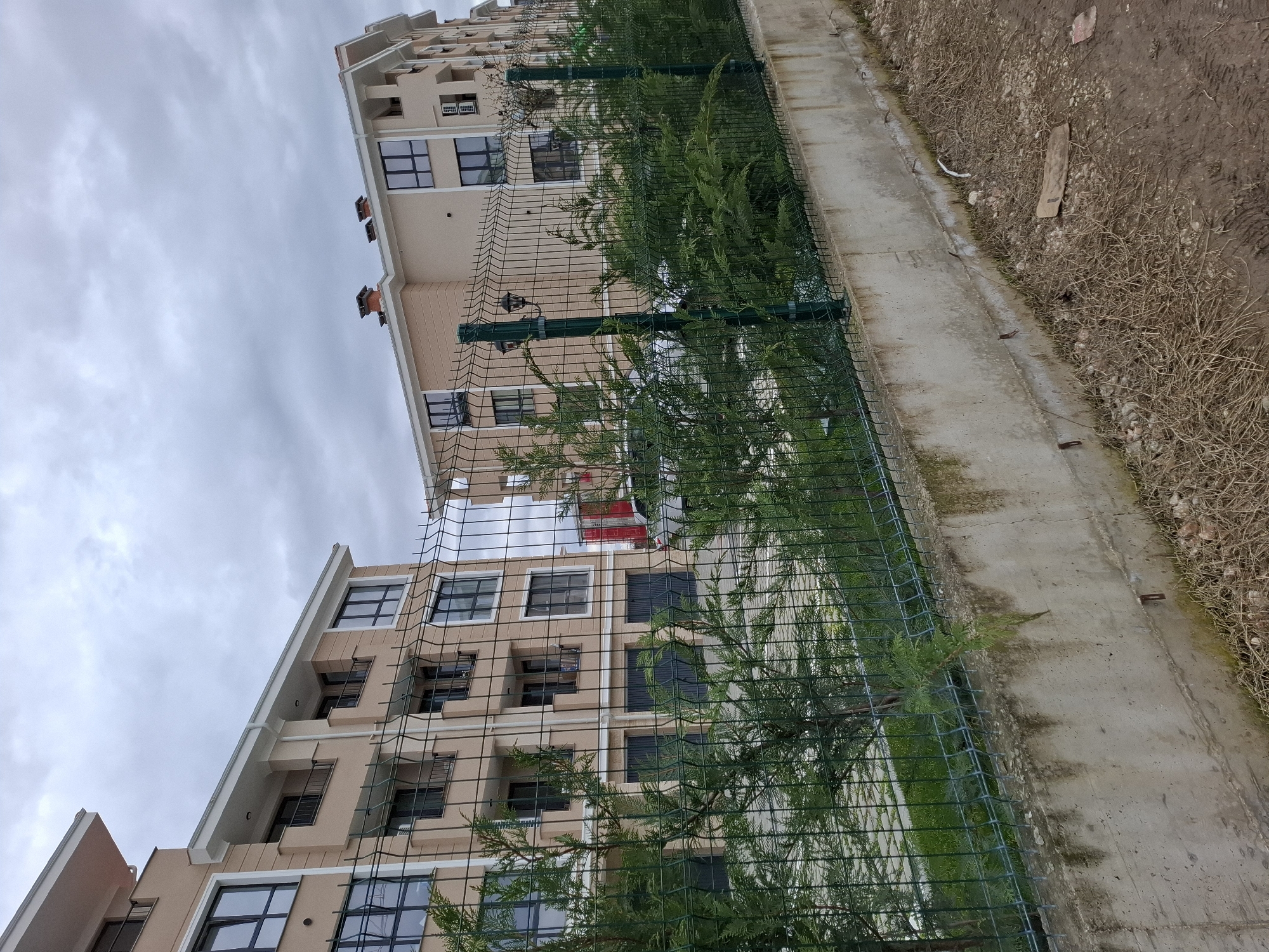 low-angle view of a multi-story residential building behind a green metal fence, likely located in a residential area of Plovdiv, Bulgaria. The building has a light beige facade with dark-framed windows. The fence is partially obscured by evergreen trees. Next to the fence is a concrete sidewalk bordering a dirt area with dry grass and debris. The sky is overcast. No people are visible.