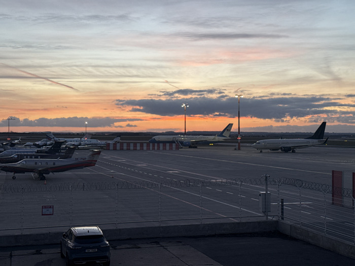 - "The image depicts an airport apron at either sunset or sunrise, characterized by a vibrant orange and pink horizon transitioning to a darker grey-blue sky, marked by faint contrails and scattered clouds" by FM-toXsi1, licensed under CC BY 4.0