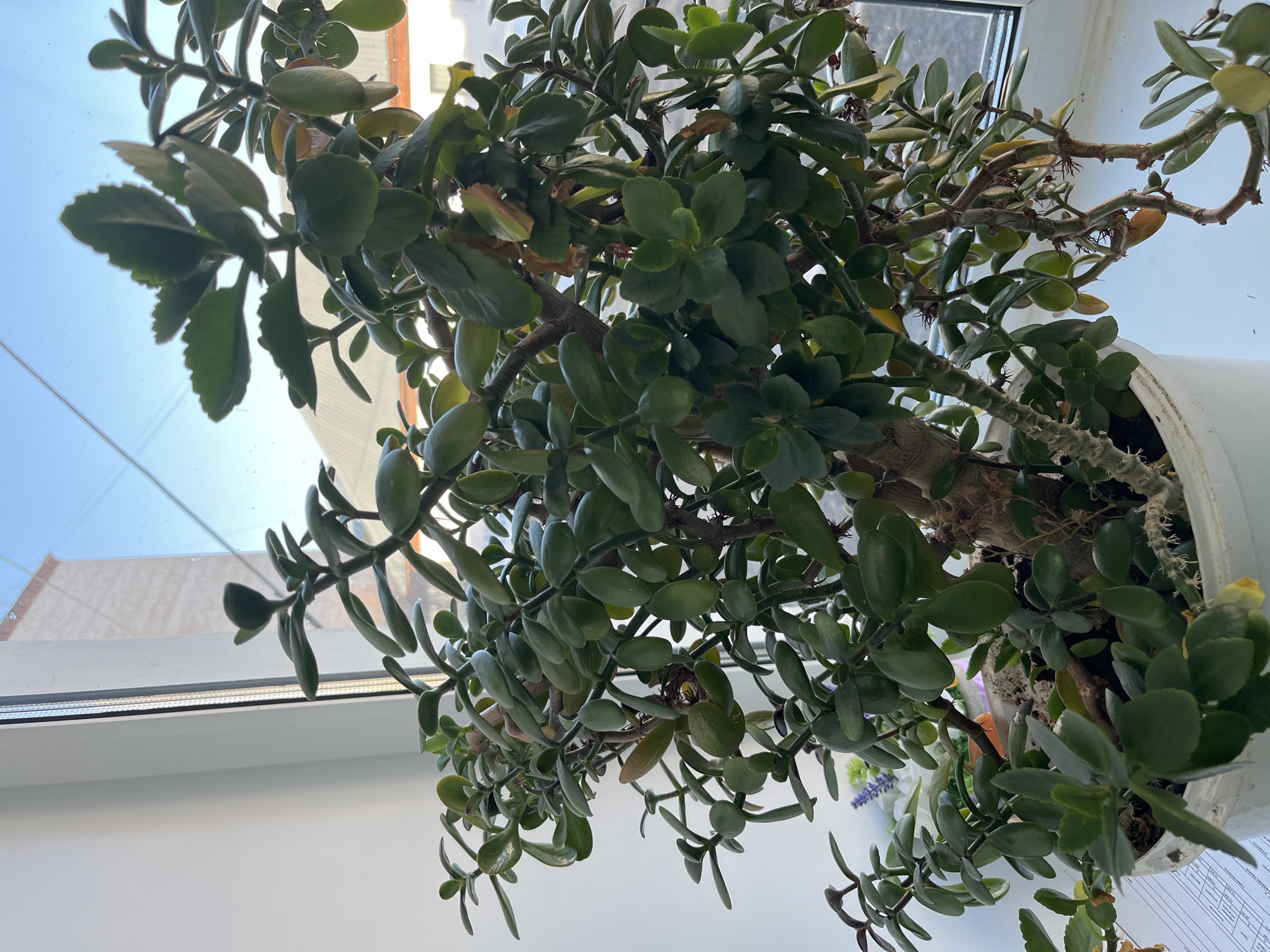 The image depicts a jade plant in a white pot, positioned on a white windowsill in front of a window