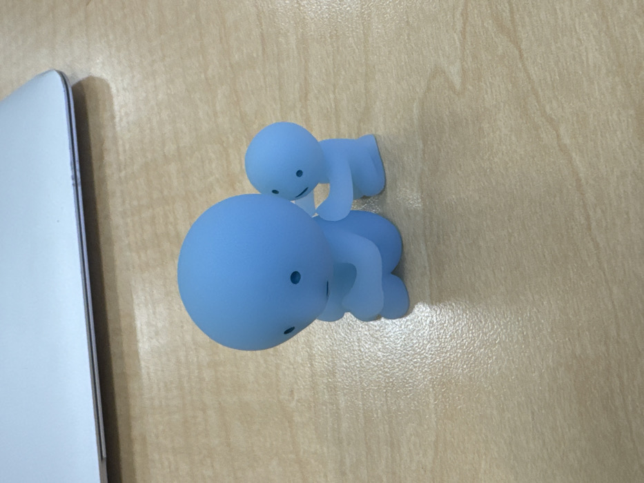 A light blue, stylized figurine depicting a parent and child rests on a wooden surface. The "parent" figure is larger with a spherical head, small eyes, and short, curved limbs. The "child" figure is smaller, also with a spherical head and simple limbs, positioned on the parent's back in a playful manner. A white object with a metallic edge is visible on the left side of the image, likely a tech device like a laptop or tablet.