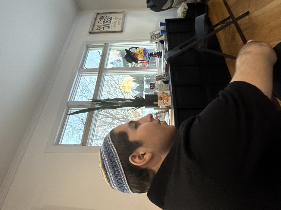 A man wearing a crocheted blue and white kippah is viewed in profile. He is looking toward a window. The window is surrounded by a white frame and has a wooden sign above it. A leafy plant stands near the window. A black shelving unit behind the man holds framed pictures, knickknacks, and an unusual decorative object. A folding chair sits in front of the shelving unit. The man is wearing a black shirt. The room has white walls and a wooden floor.