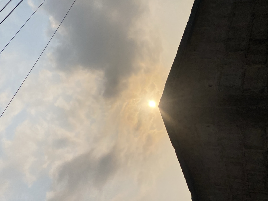 A low-angle shot captures the sun partially obscured by clouds. Silhouetted power lines are on the left. A dark, angular structure occupies the right side, possibly a building or bridge. Light filters through the clouds creating a soft, hazy ambiance around the sun, which is positioned near the corner of the structure.