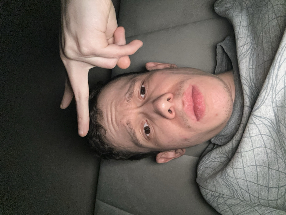 - "The image displays a headshot of an adult male, likely in his 20s or 30s, positioned against an upholstered grey background, possibly a vehicle seat or sofa" by FM-OhWro1, licensed under CC BY 4.0