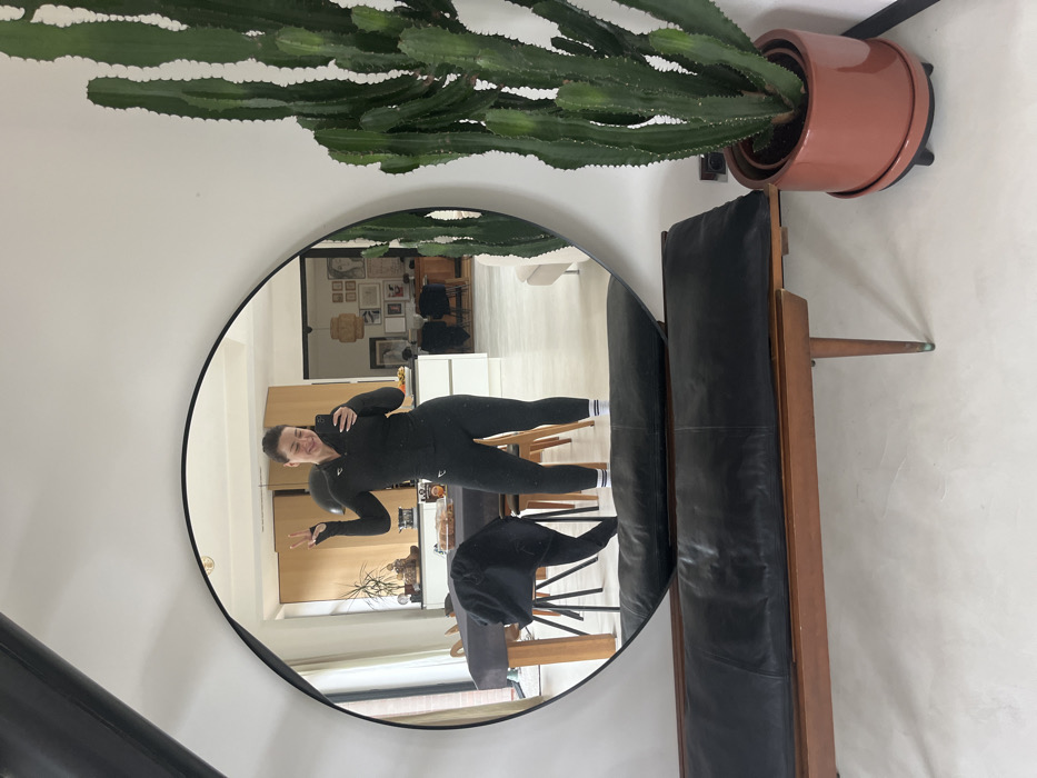 This image depicts an indoor scene, purportedly located in the city of Carency, France. The primary subject is a female individual captured in the reflection of a large, circular wall-mounted mirror with a black frame. She is smiling, has dark hair, and is wearing a black long-sleeved athletic top with a white logo on the chest and matching black athletic leggings. Her socks are white with horizontal black stripes. She holds a smartphone in her right hand, actively taking a selfie, while her left hand is raised in a "peace sign" gesture. The mirror's reflection reveals an open-plan domestic interior with white walls and a light-colored floor. To the left within the reflection, a dark rectangular dining table with wooden legs is visible, with a black garment draped over a chair. Further back, a modern kitchen area with white cabinetry and a light countertop is seen, featuring a bowl containing bread or pastries. Beyond the kitchen, a living area is reflected, including a light-colored sofa and multiple framed pictures arranged on a wall. A woven pendant light fixture hangs from the ceiling in the background. Outside the mirror's frame, to the right, a tall, green multi-stemmed succulent plant is situated in a rust-colored ceramic pot, which rests on a small black stand on the light-colored floor. Directly beneath the mirror, a wooden bench with a dark, possibly black leather, cushion is positioned. The bench has tapered wooden legs. A plain white wall constitutes the backdrop for the mirror and plant.
