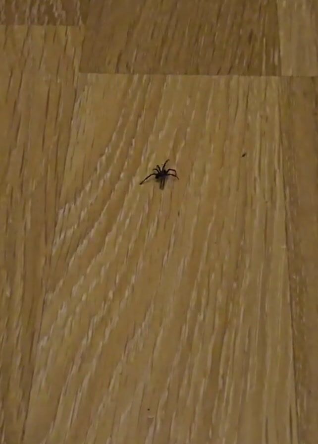 spider on a wood-patterned floor. The spider is black and moving slowly. The floor is made of laminate planks. The camera is positioned above the spider and remains stationary throughout the video. There is no audio except for an unidentified thumping noise at the beginning.