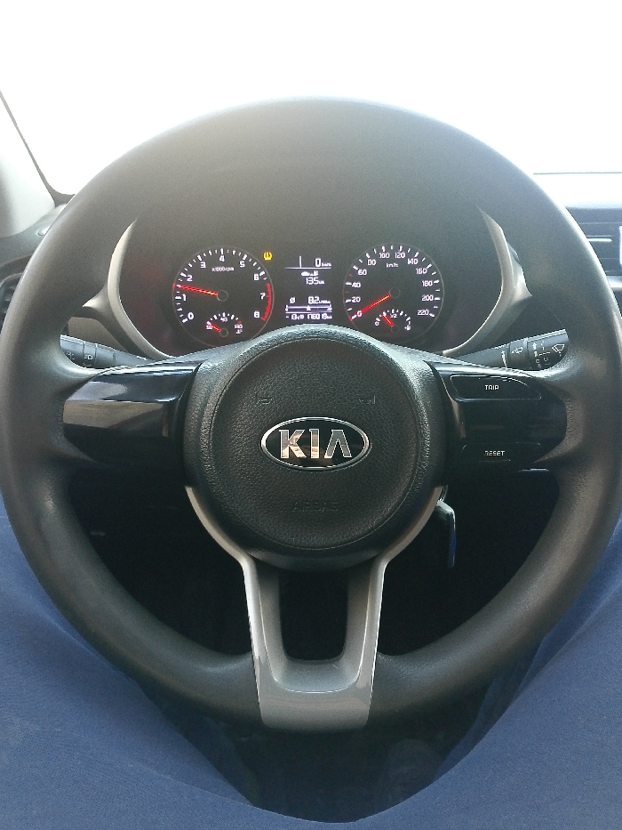 A Kia steering wheel fills the frame with the dashboard instruments above