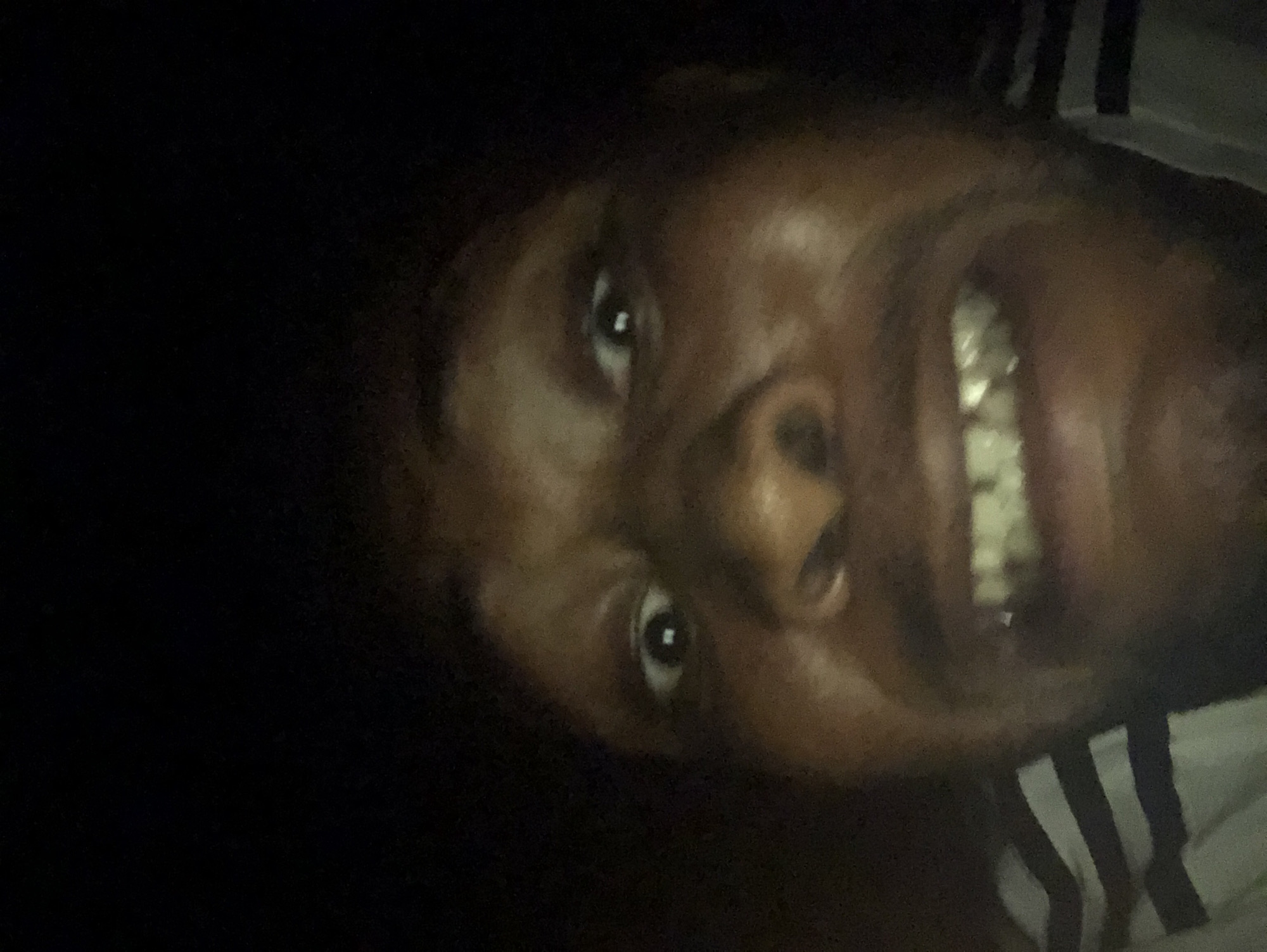 person's face with dark skin, white teeth, and a black-and-white striped shirt. The background is dark. The location is not specified.
