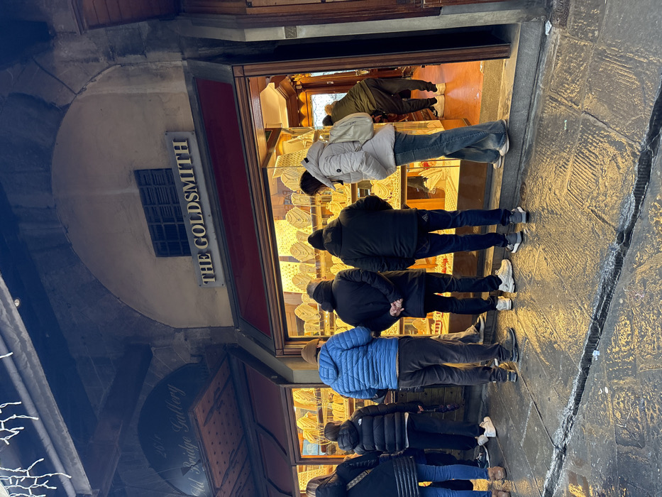 This image depicts a pedestrian scene on the Ponte Vecchio in Florence, Italy