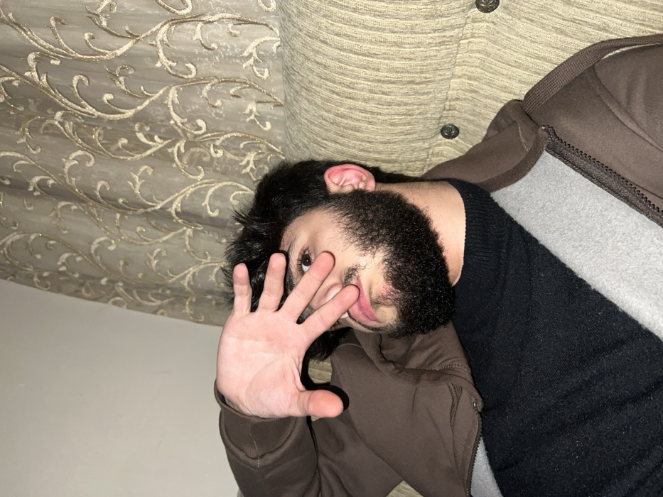 A person with dark hair and a full beard is lying down, shielding their face with their hand. They are wearing a brown hoodie over a black sweater, with a gray fleece visible underneath. The background features a patterned curtain and a light-colored cushion or sofa. The person's hand is held up, seemingly in an attempt to block the camera.