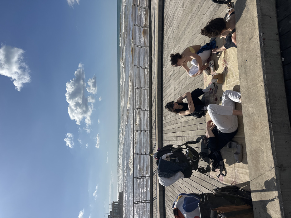 A sunny outdoor scene depicts four individuals gathered on a wooden promenade at the Tel Aviv Port (Namal Tel Aviv) in Tel Aviv, Israel, with the Mediterranean Sea in the background. The ground consists of light brown wooden planks, with a light gray concrete step or barrier visible in the immediate foreground, obscuring the lower half of one person. On the promenade, a light-colored woven mat is spread. Four individuals, appearing to be young adults, are positioned on or near the mat. 1. **Leftmost individual:** Partially visible, lying prone on their back with their head towards the camera, wearing a dark top and light-colored long pants. Light gray sandals are beside them. 2. **Center-left individual:** Seated cross-legged, facing right, wearing a black sleeveless top and dark pants, with dark sunglasses resting on their head. 3. **Center-right individual:** Seated with bent legs, facing left, wearing a yellow brassiere-style top and white pants. 4. **Rightmost individual:** Partially visible beyond the concrete barrier, seated with bent legs, facing left, wearing a dark top. On the mat, several items are visible, including cups containing beverages (one with a straw) and small boxes. A black baby stroller, draped with dark clothing, stands to the left of the group. Adjacent to the stroller is a bag with a colorful, abstract pattern. Beyond the promenade, a dark metal railing with multiple horizontal bars separates the wooden deck from the sea. The Mediterranean Sea is active with noticeable waves and whitecaps, reflecting strong sunlight. On the far left, a multi-story, light-colored concrete or stone structure, characteristic of the Tel Aviv Port, extends into the water. The sky is clear blue with several scattered white cumulus clouds. Strong sunlight is evident, casting distinct shadows from the railings onto the wooden promenade.