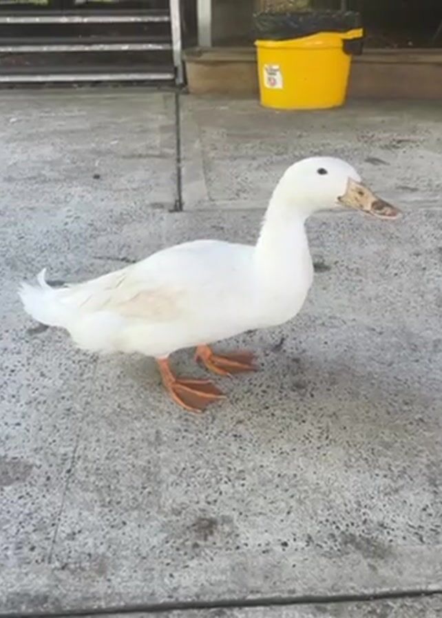 A white duck stands on a concrete surface. The duck has orange feet and a speckled bill. Behind the duck is a yellow bucket and a railing. The duck quacks.