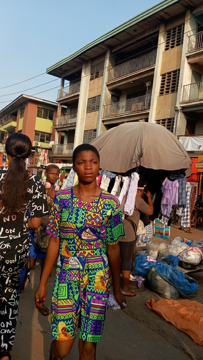 A young woman in a brightly patterned two-piece outfit stands in a bustling outdoor market