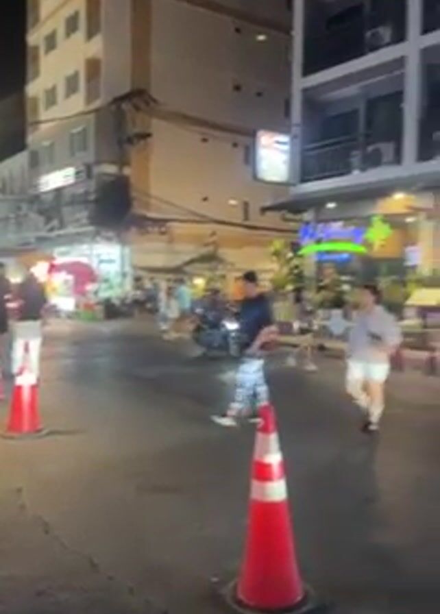 nighttime street scene in what appears to be a tourist area. The street is lined with buildings, some with signs in English. There are people walking, some crossing the street, and others standing near food stalls. Several vehicles are visible, including cars, motorcycles, and a small red truck. Orange traffic cones are placed along the street, possibly indicating a construction zone or traffic diversion. The scene is lit by streetlights and the lights from businesses. The overall impression is a busy, lively street at night.