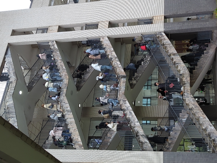 - "A building's zigzagging staircases are packed with people" by FM-mFakA3, licensed under CC BY 4.0