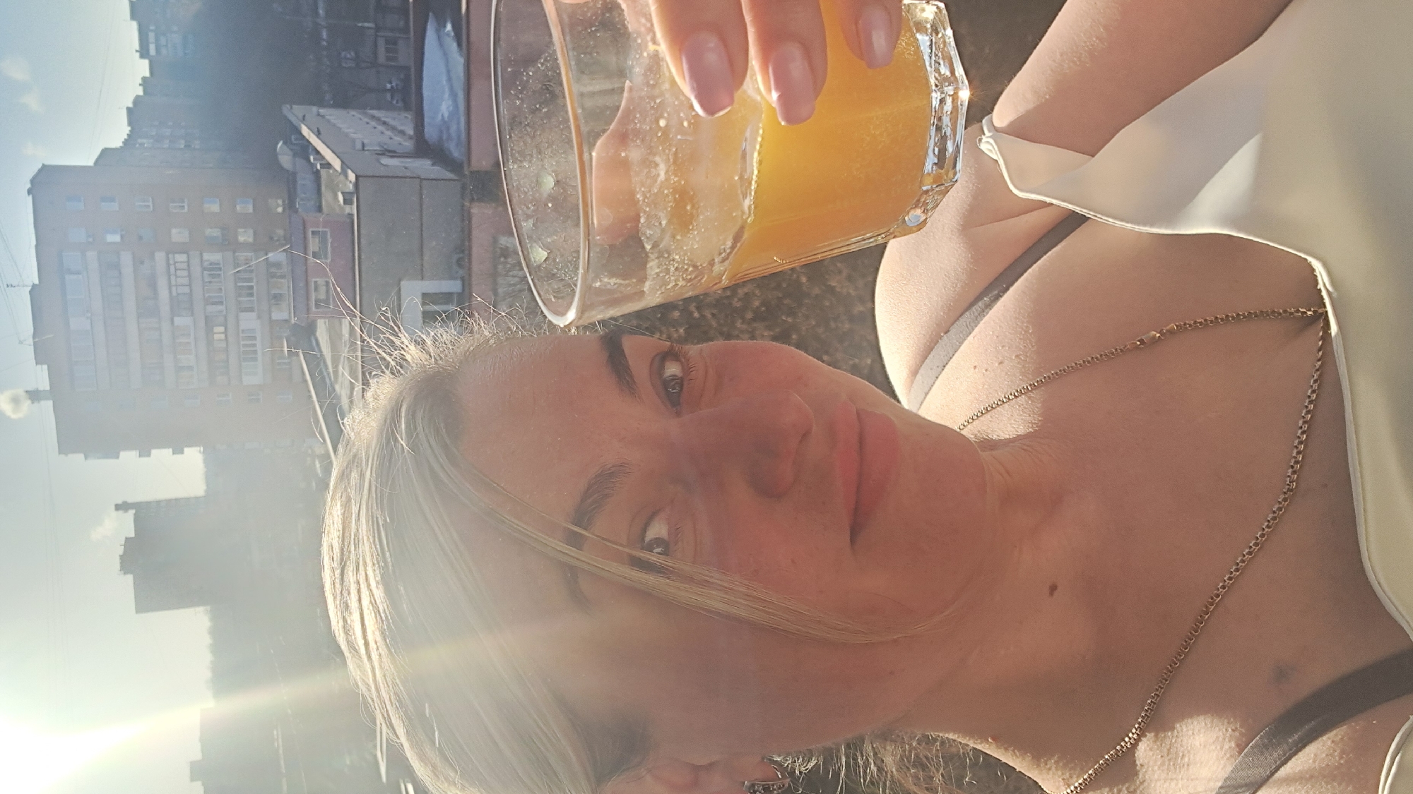 A medium close-up shot captures a woman holding a glass of orange juice outdoors in Elektrostal, Russia. The woman has blonde hair, fair skin, and is wearing a white top with a gold necklace. She is looking directly at the camera. Behind her, in soft focus, are multi-story buildings typical of an urban landscape in Elektrostal. The bright sunlight suggests it is daytime. The buildings provide context for the location as Elektrostal.