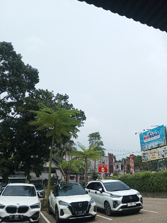 This image depicts an outdoor parking area in Tân Kỳ Commune, Vietnam, under an overcast, light gray sky. A dark, corrugated roof edge is visible in the upper foreground, extending from the left to the upper right. Three white sport utility vehicles (SUVs) are parked in marked spaces in the midground. From left to right: a white BMW SUV with license plate "KT 1508 YL" (with a "06-27" date), a white Nissan Kicks SUV with license plate "B 1330 JB" (with an "08-27" date), and a white Toyota SUV, possibly an Avanza or Veloz, with license plate "F 1362 KO" (with a "07-27" date). Additional vehicles are partially visible behind the BMW on the far left. To the left, large, dense trees with dark green foliage dominate the background, extending high into the frame. Several slender trees with green, fern-like fronds are interspersed throughout the midground. In the right midground, a red circular "No Entry" sign with a white horizontal bar is present, mounted on a pole, with Indonesian text "DILARANG MASUK" (No Entry) printed below it in red on a white rectangular sign. Further to the right and above the vehicles, a large billboard is visible. It features blue text "MINIMANIA" and "TAMAN MINIATUR DUNIA" with cartoon characters, and below that, text reading "Oleh-Oleh Khas Cipanas" along with images of cartoon cows. Various buildings and structures, some with red elements, are visible behind the trees and signs in the distant background. The ground consists of a paved surface with white parking space markings.