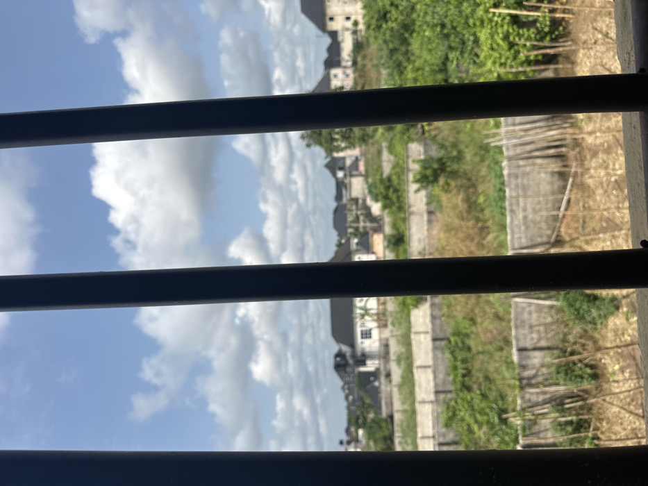 This image depicts an exterior scene in Obinze, Nigeria, observed through two prominent, dark vertical metal bars in the immediate foreground. The midground consists of an expansive, undeveloped plot of land characterized by a mix of green and dry vegetation. Several low, unrendered concrete block walls are visible, segmenting the land horizontally. Towards the lower midground, numerous raw wooden poles are stacked or upright. The background features a residential area with multiple houses, primarily single-story, distinguished by dark-colored roofs and light-colored facades. The sky above is partially clear, displaying blue patches interspersed with numerous white cumulus clouds. No individuals or specific activities are present in the scene.
