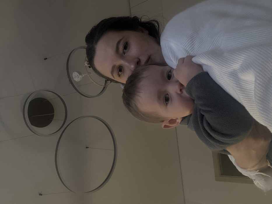The image depicts an adult female holding an infant indoors in Akulovo (Gp Kubinka), Russia. The adult, with dark hair and wearing a light-colored, ribbed sweater, is partially visible from the chest up, positioned slightly to the right of the frame's center. She holds the infant, who is wearing a dark grey long-sleeved garment, against her left shoulder. The infant's left hand is near its chin. Both individuals are looking towards the camera. The background consists of a light-colored ceiling from which three circular light fixtures are suspended. One large light fixture with a dark central disc is prominent, with another large ring-shaped fixture and a smaller partially visible fixture also present. A portion of a light-colored wall and what appears to be a doorway is visible on the left side of the frame. The lighting in the scene is dim.