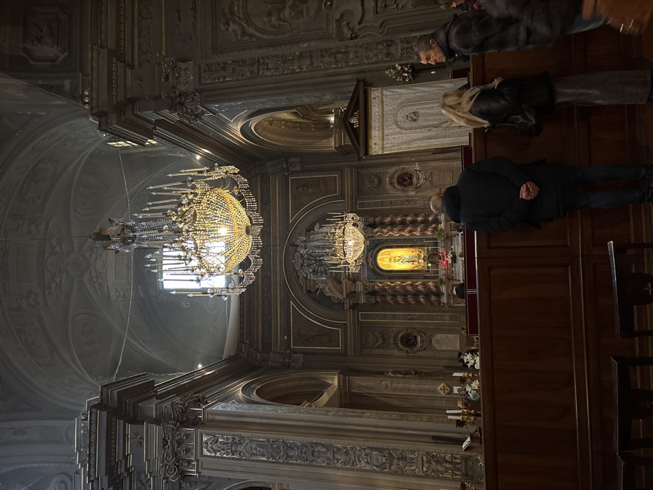 The image depicts the interior of the Basilica di San Francesco in Ferrara, Italy. The scene shows a grand, ornate Baroque church nave with a high, dark, vaulted ceiling adorned with faded frescoes. Two large, multi-tiered crystal chandeliers, brightly illuminated, hang prominently from the ceiling, with the upper chandelier catching natural light from an unseen window. The walls feature dark paneling or paint, accented by extensive gilded molding, decorative relief sculptures, and large fluted pilasters with Corinthian capitals. In the center, a brightly lit side altar or shrine is visible, featuring a golden niche housing a light-colored statue, flanked by twisted, ornate columns. Red fabrics, white flowers, and candle holders are arranged at the base of this shrine, above which hangs a smaller chandelier. To the left of the shrine, a dark wooden stand holds several white candles and flowers. To the right, a tall, narrow structure draped in white fabric with a decorative wooden pediment stands. In the foreground, a dark wooden partition or pews are present. Three individuals are visible: one male, center-left, seen from the back, wearing a dark winter coat and trousers, standing with hands clasped behind his back, observing the shrine; one female, center-right, with long blonde hair, wearing a dark jacket and a light-colored long skirt, also observing the shrine; and one male, far right, in profile, with short, curly dark hair and a dark patterned jacket, looking towards the right side of the image. Indistinct figures are visible further in the background near the central shrine. The overall atmosphere is quiet and observant.