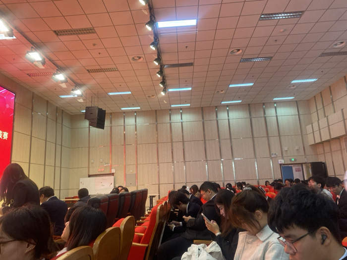 n auditorium in Qing Dao Shi, China, located at latitude 36.077 and longitude 120.413. The room has a light brown tiled ceiling with fluorescent lights and multiple speaker systems, with red, wooden, and upholstered theater seating for 100+ people, and a large, blank white screen at the front of the room. The scene depicts individuals in business casual attire sitting, listening, and using their phones in the auditorium, which is sparsely populated, with an exit sign visible to the right of the room. The individuals are engaged in conversation, listening, and looking down at their phones, some of them are holding their phones in their hands.