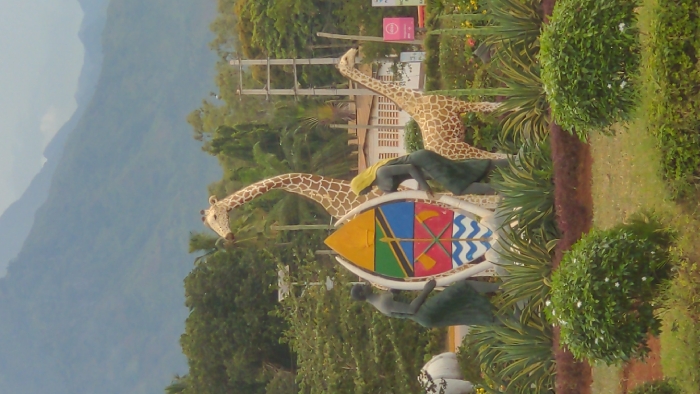 The image displays a monument at the Morogoro Clock Tower Roundabout in Morogoro, Tanzania, set against the backdrop of the Uluguru Mountains. In the foreground, manicured garden beds feature green shrubs and spiky succulent-like plants. The central monument consists of two dark-colored human statues, one male figure on the left and one female figure with a yellow head covering on the right, positioned as if supporting a large, colorful Tanzanian Coat of Arms. The shield-like emblem is flanked by two curving white tusks. Behind this central arrangement stand two light-brown giraffe statues with darker brown patches; a taller giraffe is on the left and a shorter one on the right. A partial white elephant statue is visible on the far left. The midground includes dense green trees, a light-colored building with multiple windows, and utility poles. The far background features hazy blue-grey mountains under a light sky.