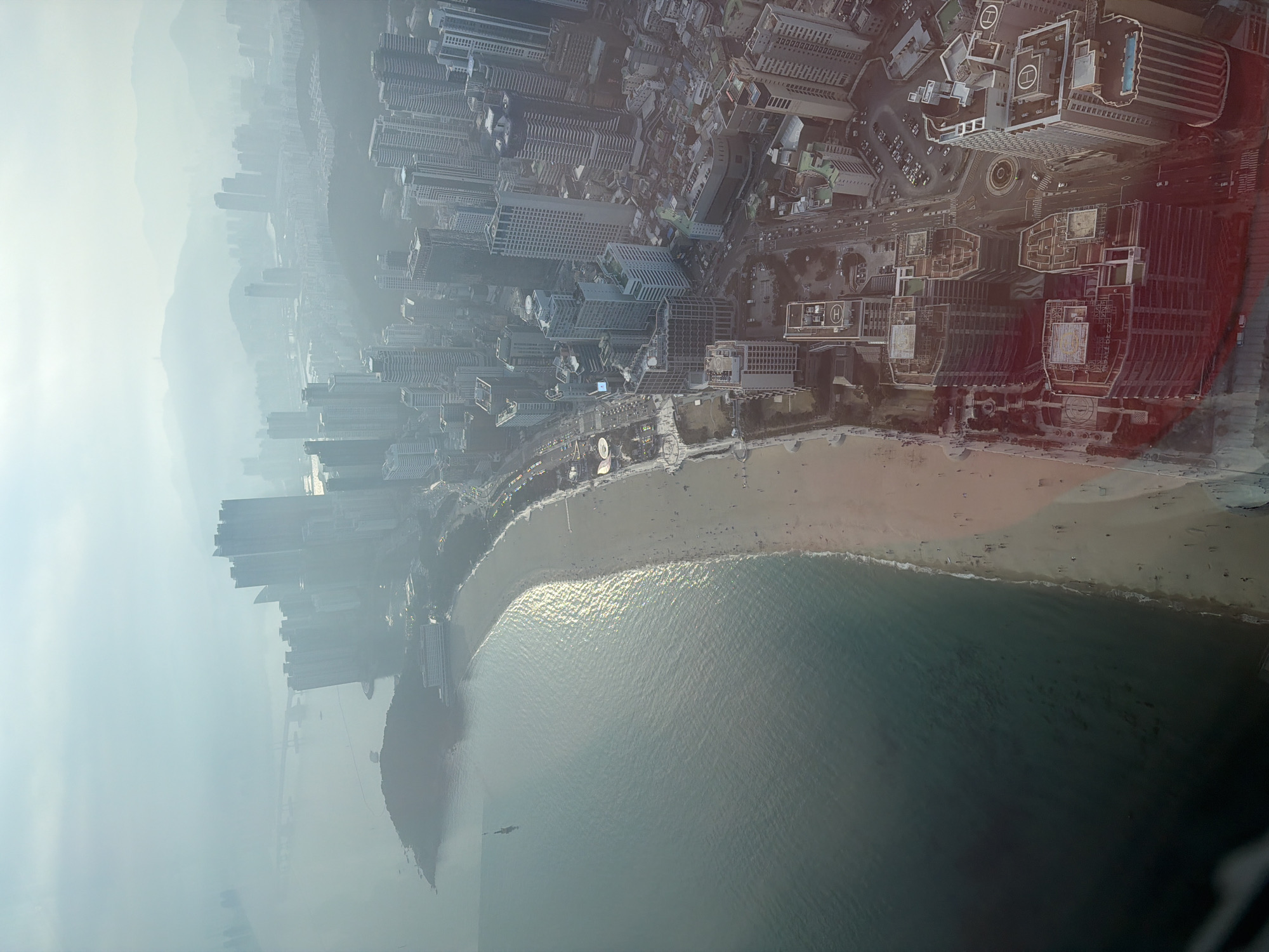 n aerial view of Haeundae Beach in Busan, South Korea. The beach is crescent-shaped with light-colored sand and clear turquoise water. Tall buildings line the coast on one side, while the other side faces the ocean. There are a few people visible on the beach. The weather appears hazy or foggy, obscuring distant views.