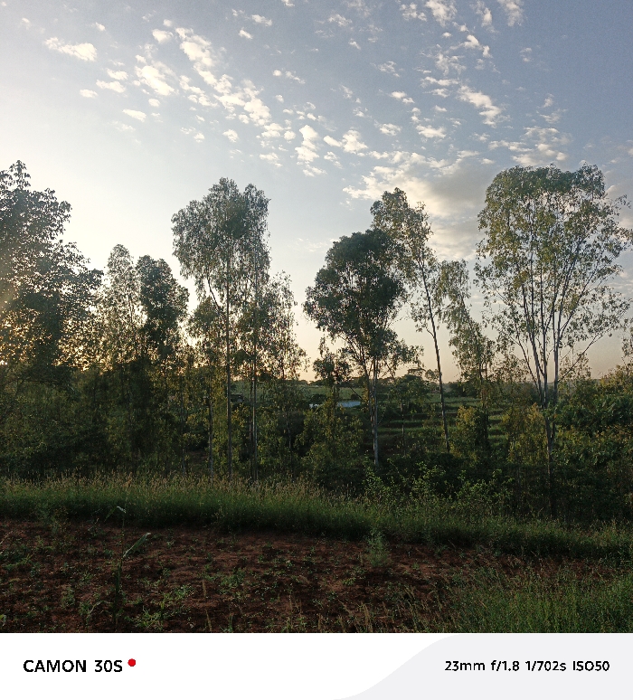 A serene landscape features a row of tall, slender trees silhouetted against a sky dappled with clouds. The foreground comprises a grassy verge bordering bare earth, suggesting recently disturbed soil. Distant fields or cultivated land can be glimpsed through the trees. Soft, diffused light suggests either dawn or dusk, imparting a tranquil mood to the scene. The bottom of the image displays technical details: "CAMON 30S" and "23mm f/1.8 1/702s ISO50."