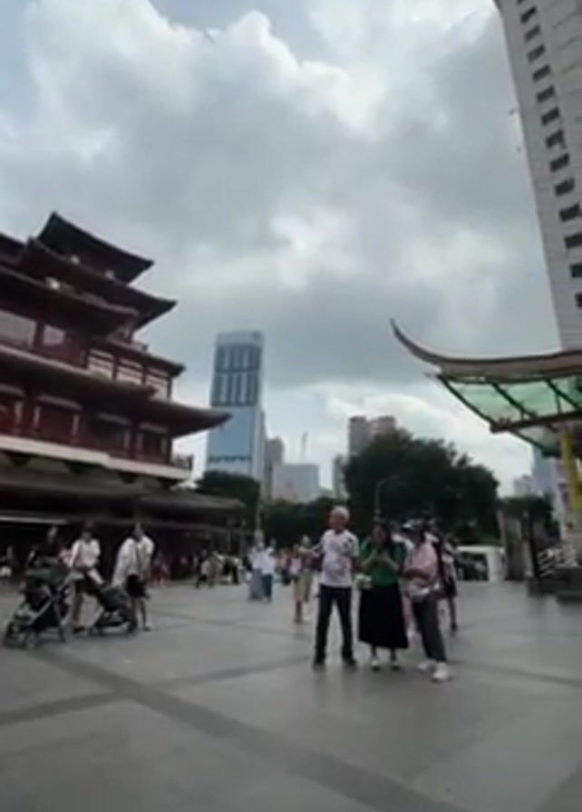 public square in Singapore. There are a variety of people walking around, including tourists and locals. In the background are several buildings, including a traditional Chinese temple, a modern skyscraper, and an apartment building. The sky is cloudy and the weather appears to be mild.