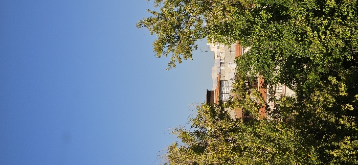 The image displays an outdoor, daytime scene within the city of Kiryat Motzkin, Israel, captured from an elevated viewpoint looking over a developed area. The upper approximately two-fifths of the frame consists of a clear, cloudless blue sky. The midground and foreground are dominated by the upper canopies of two large, leafy trees, one on the left and another on the right, framing a central view of urban structures. The foliage is primarily green, with some leaves exhibiting yellowish hues. Between the trees, a residential or urban landscape is visible. Several buildings feature reddish-brown tiled roofs and light-colored (white or beige) facades. A distinct dark brown or black structure is positioned on the roof of a building in the mid-left area. Farther in the background, numerous lighter-toned buildings with flat roofs extend across the horizon. Beyond these structures, faint, light-colored mountains or hills are discernible against the distant sky. No individuals, animals, or explicit actions are present within the scene.