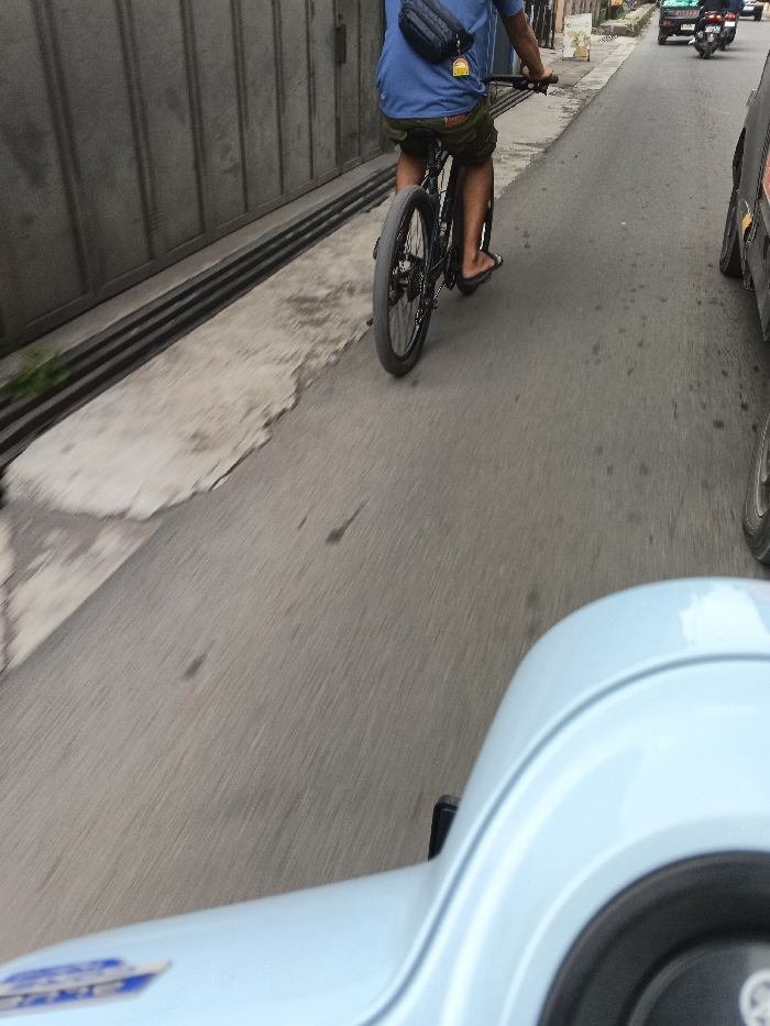 The image captures a street scene in Margahayu, Indonesia, viewed from a light blue scooter. The foreground displays the top of the scooter's front fairing. The asphalt road shows motion blur, indicating forward movement. In the midground, a male individual is riding a black bicycle away from the camera. He wears a blue short-sleeved shirt, dark shorts, and dark flip-flops. A black fanny pack is visible across his back, and a yellow tag hangs from his shorts. To the left of the bicyclist, a grey building wall with horizontal paneling borders a narrow concrete sidewalk, which includes a parallel drainage grate. To the right of the bicyclist, a partial view of a dark-colored vehicle is present. Further in the background, a small truck with a green canopy and a motorcycle are also visible, moving along the street.