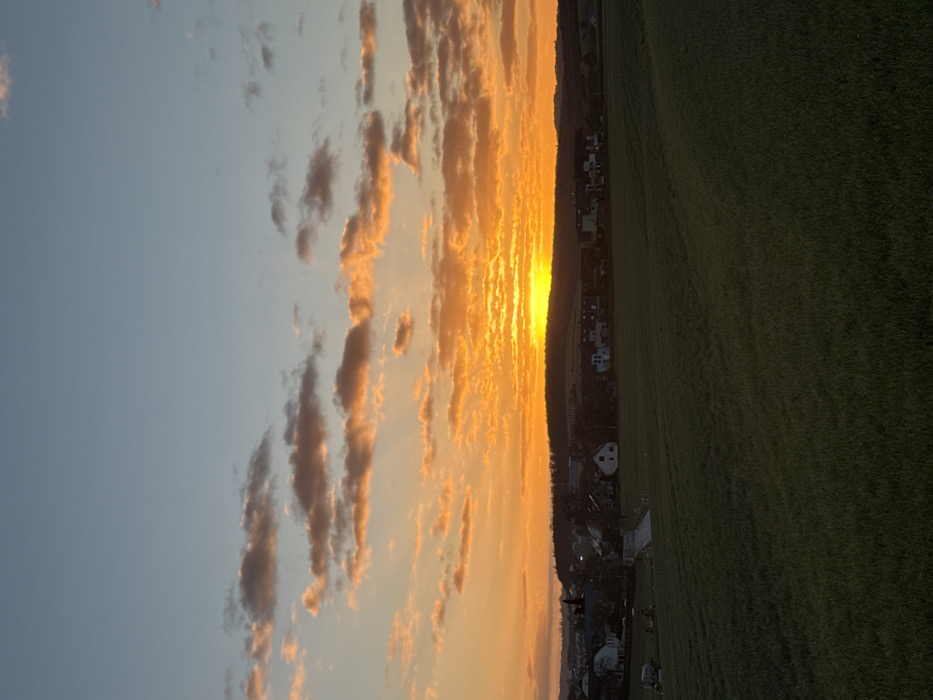 The image displays a panoramic view of Olingen, Luxembourg, at dusk. The sky occupies approximately the upper two-thirds of the frame, dominated by a sunset featuring intense orange and yellow light concentrated near the horizon, emanating from the visible setting sun. Clouds are present across the mid-upper sky, illuminated from below in warm orange and pink tones, transitioning to a pale blue sky at the zenith. Below the illuminated sky, a dark, undulating treeline or ridge forms the immediate horizon. Below this, a portion of the town of Olingen is visible, consisting of numerous residential-style buildings with light-colored facades and dark roofs, interspersed with trees. Some individual lights are discernible within the town. In the immediate foreground, covering approximately the lower third of the image, is a large, dark green field, likely agricultural land, exhibiting subtle textural variations but no distinct features or subjects. No human figures or active interactions are visible.