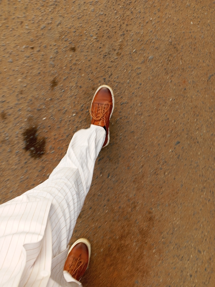 The image displays a high-angle, downward perspective of the lower legs and feet of one individual. The subject wears white trousers adorned with a fine, light grid-patterned pinstripe. Brown leather lace-up shoes with prominent white soles are worn on both feet. The left foot is observed in a forward mid-stride position, exhibiting motion blur. The right foot is positioned slightly behind and to the lower left of the left foot, partially visible. The ground surface is an unpaved, uneven reddish-brown granular material, consistent with dirt or fine gravel. Several small, irregular dark patches, suggestive of moisture or staining, are visible on the ground, primarily in the upper left quadrant. This scene is located in Ilorin, Nigeria.