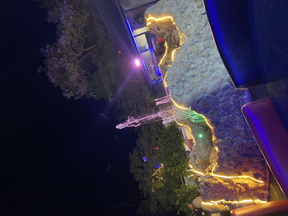 A nighttime scene features a stone structure illuminated with yellow and green lights. A fountain sprays pink-lit water towards the dark sky. Trees frame the fountain, some with colorful lights. A building is visible in the background with blue lights accentuating its form. Seating is visible in the foreground, suggesting an outdoor dining or entertainment space. The scene combines natural elements with artificial lighting, creating a vibrant and somewhat surreal atmosphere.