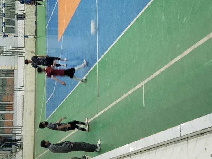 A low-angle, tilted indoor shot captures a game in progress. On a blue, orange, and green court, players wearing shorts and shirts maneuver around a white ball. Some players are in black tops, one in a red top. The court is marked with white lines. A net is visible on the left side. A tiled wall borders the edge of the court. The perspective of the shot gives the scene a slightly distorted appearance.