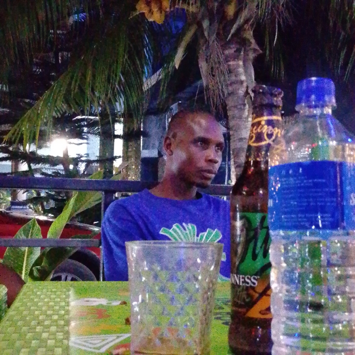 A man in a blue shirt sits at a green woven table with a palm tree behind him. An empty patterned glass sits to his left, with a Guinness bottle next to it. A plastic bottle of water with a blue cap is partially obscuring the beer. A black metal railing and tropical foliage add to the outdoor setting. The lighting suggests it is either late evening or early morning.
