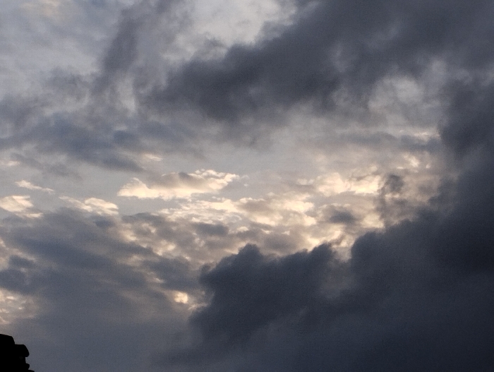 The image displays an overcast sky over Guacara, Venezuela. The scene is dominated by a dense formation of clouds, varying in tone from dark grey to lighter shades. Patches of brighter, yellowish-white light are visible, indicating either sunlight breaking through the cloud cover or atmospheric illumination from a low sun angle. The clouds are layered and unevenly distributed, with darker, heavier masses occupying the lower and right portions of the frame, and more diffused, illuminated clouds in the central and upper-left areas. A small, dark, undefined silhouette, possibly the edge of a structure, is present in the extreme lower-left corner. There are no identifiable people, specific objects (beyond the clouds and potential structure edge), actions, or interactions depicted.