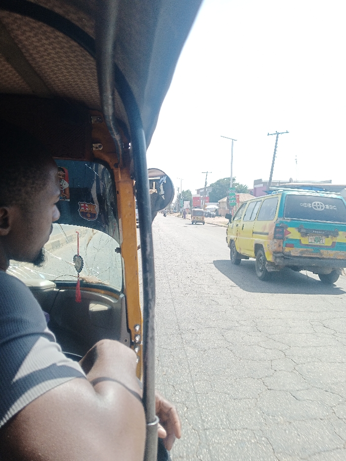 - "The image displays a daytime scene on a cracked asphalt road in Shaba, Nigeria, captured from the interior of a yellow and black tricycle" by FM-IKO9B3, licensed under CC BY 4.0