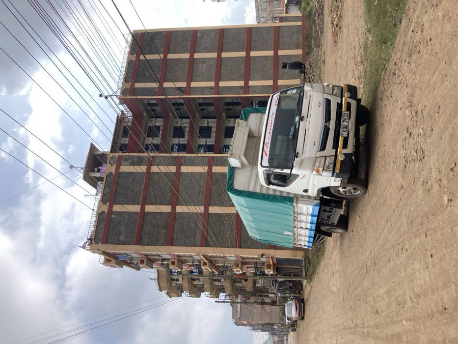 A white truck with a green tarp stands on a dirt road alongside buildings with grey walls and red-brown accents