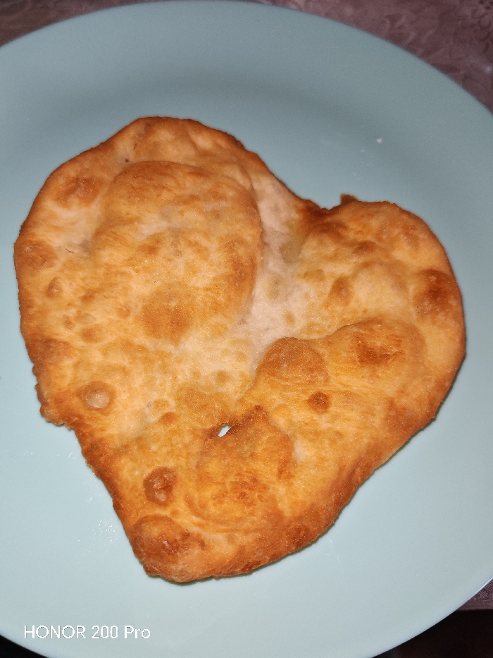 - "A single, irregularly shaped, golden-brown fried dough pastry is centrally positioned on a light blue round plate" by FM-rkdr63, licensed under CC BY 4.0