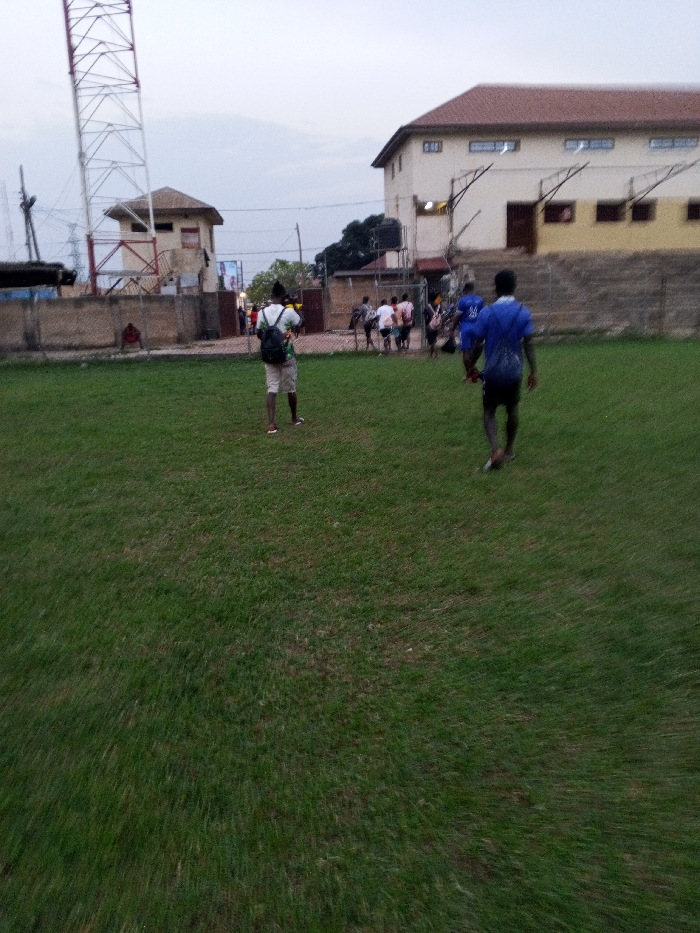 A grassy field stretches out towards a distant building. Several people are gathered near the gate. Two men, one in a blue shirt, are walking on the field. A metal tower stands tall in the background near a small building. The scene suggests an outdoor gathering on a sports field or park.