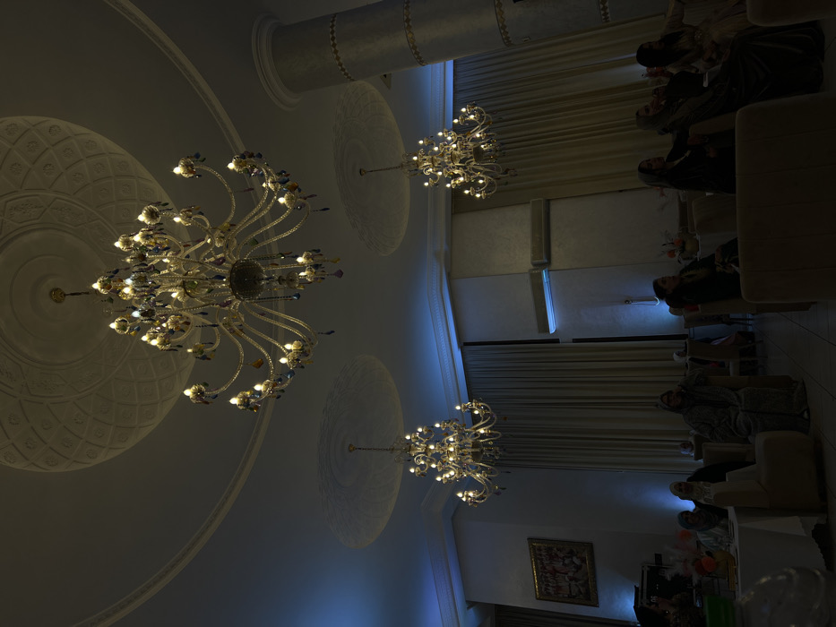 A low-angle shot captures a room adorned with ornate chandeliers and decorative ceiling medallions. Curtains line one side of the room, where several individuals are seated. The lighting casts soft shadows, emphasizing the intricate details of the chandeliers and the room's architecture. A framed picture hangs on the wall near the bottom of the frame.