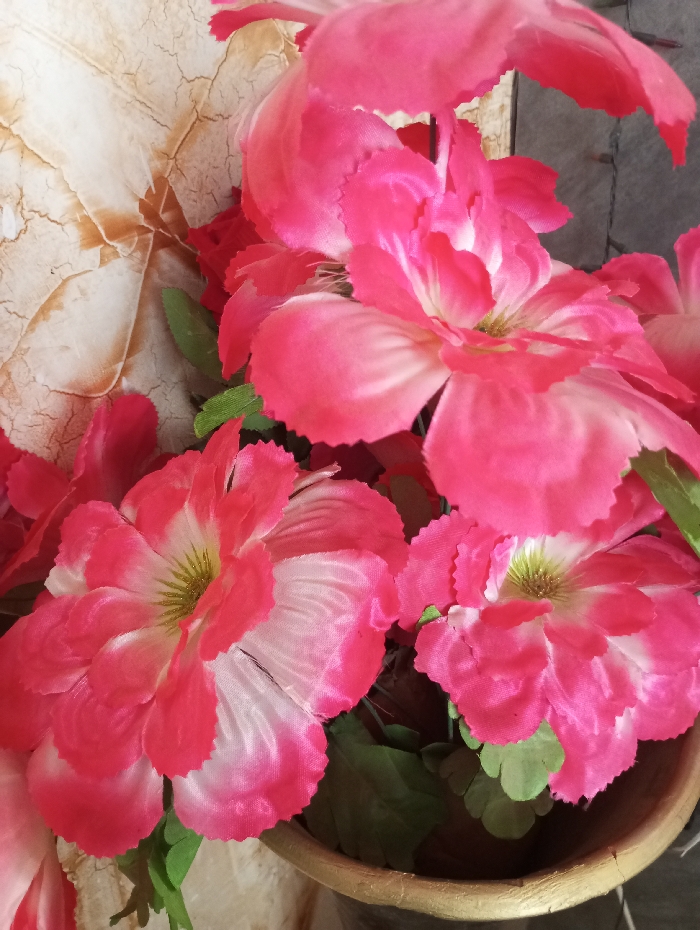 The image displays a close-up view of an artificial floral arrangement. Multiple fabricated flowers are present, each featuring hot pink petals that transition to white towards their centers, where yellow-green stamen-like structures are visible. Green artificial leaves are interspersed among the blooms. The flowers are contained within a pot, with a golden-brown, metallic-rimmed edge visible in the lower right portion of the frame. The background on the left consists of a light-colored, textured surface exhibiting a cracked or distressed pattern, possibly a wall. A darker, mottled gray surface is partially visible in the upper right background. No human subjects or activities are depicted. The specific location within Gwarinpa, Nigeria, cannot be determined from the visual information provided.