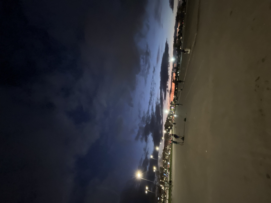 A sideways shot shows a dark cloudy sky transitioning into a vibrant sunset near the horizon. A line of streetlights illuminates a flat, sandy area, possibly a beach or a wide promenade. Silhouetted figures are walking near the lights. The scene evokes a sense of quiet activity during twilight.
