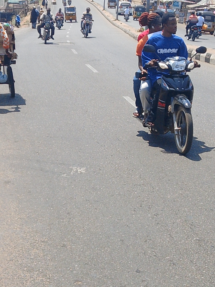 The scene depicts a multi-lane asphalt road in Lokoja, Nigeria, under bright daylight. In the mid-foreground, a black two-wheeled motorcycle is occupied by three individuals, moving towards the right. The driver, a male, wears a blue t-shirt with "CHROME" printed in white and dark sandals, gripping the handlebars. Behind him, a passenger with reddish-brown hair wears an orange t-shirt. A third passenger, seated at the rear, wears a light-colored top, blue jeans, and sandals, holding a dark smartphone in their right hand. To the far left in the foreground, a portion of a handcart laden with packages, showing one wheel and a wooden frame, is visible. The road features white dashed lane markings. In the mid-ground and background, numerous other vehicles are present, including multiple motorcycles, at least one yellow tricycle (Keke Napep), and several cars, all indicating active street traffic. Pedestrians are visible on the road shoulders and adjacent to buildings. Structures, including what appear to be market stalls and commercial buildings, line both sides of the street, with a concrete barrier separating the road from an elevated area on the right.