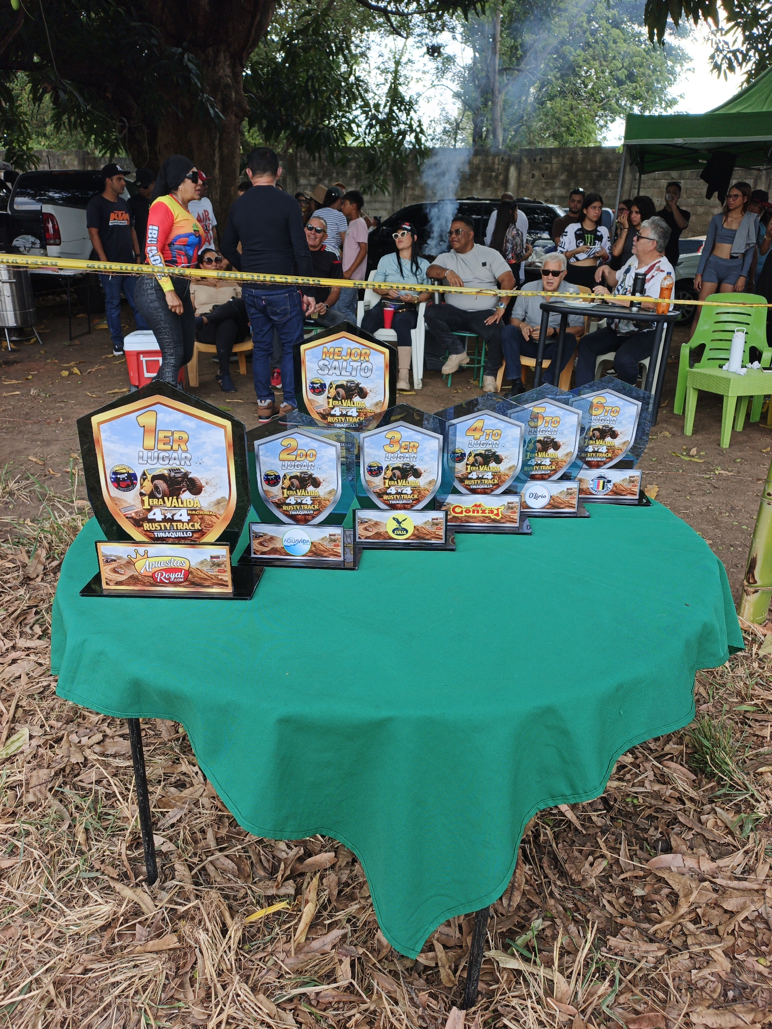 n outdoor event, likely a competition or celebration, in Tinaquillo, Venezuela. In the foreground, a table covered with a green tablecloth displays six trophies, ranging from 1st to 6th place, along with a "Best Jump" award, for an event called "Rusty Track Tinaquillo" 4x4 National series. The trophies are shield-shaped with images of off-road vehicles. Sponsorship logos are visible on the bases. Behind the table, a group of people are seated and standing, observing the scene. Some are behind a yellow caution tape. There is a cooler, folding chairs, and a green plastic chair. A white pickup truck is visible in the background. Smoke rises into the air, suggesting the presence of a grill or fire. The ground is covered in dry leaves. There are trees providing shade. The setting appears to be a casual, outdoor gathering.