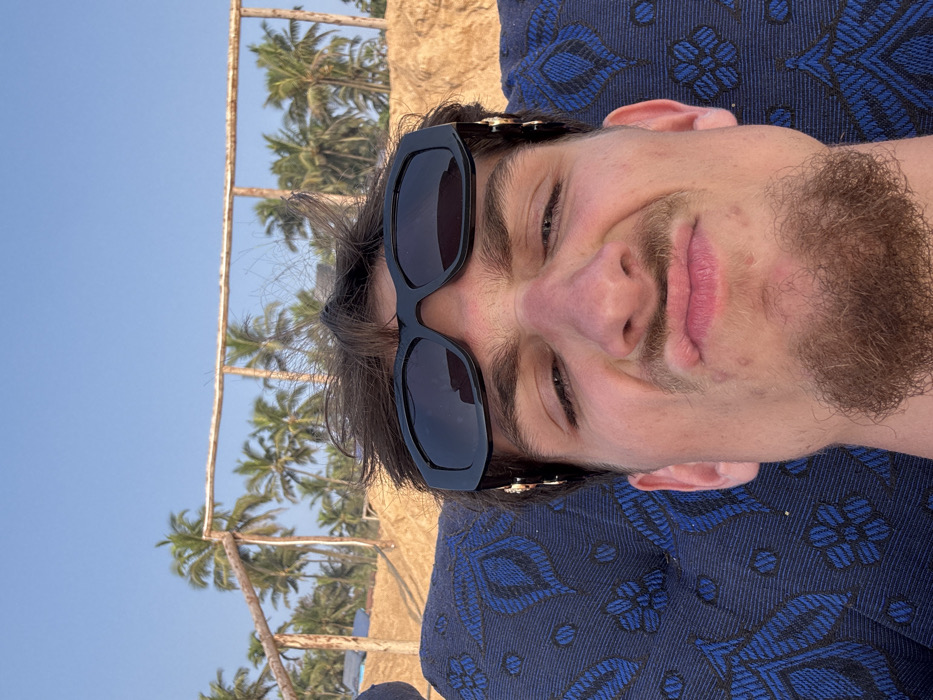 A close-up, upward-angled selfie shot depicts a young adult male lying on his back in an outdoor, sunny environment in Sinquerim, India. The subject, with disheveled dark brown hair, wears dark, rectangular-framed sunglasses with gold-colored embellishments on the temples. His eyes are partially visible beneath the sunglasses. He has a light brown goatee beard and a faint mustache. His facial expression is characterized by pursed lips pushed forward and slightly bunched cheeks. Several minor blemishes are present on his chin and lower cheeks. He rests his head on a dark blue fabric with lighter blue floral or paisley patterns. In the background, under a clear blue sky, numerous green palm trees are visible, interspersed with a rustic wooden fence constructed from upright posts and horizontal bars. Behind the fence, a sandy, light-brown elevated area or dune is present. Distant, faint structures resembling tents are visible among the trees on the left side of the frame.