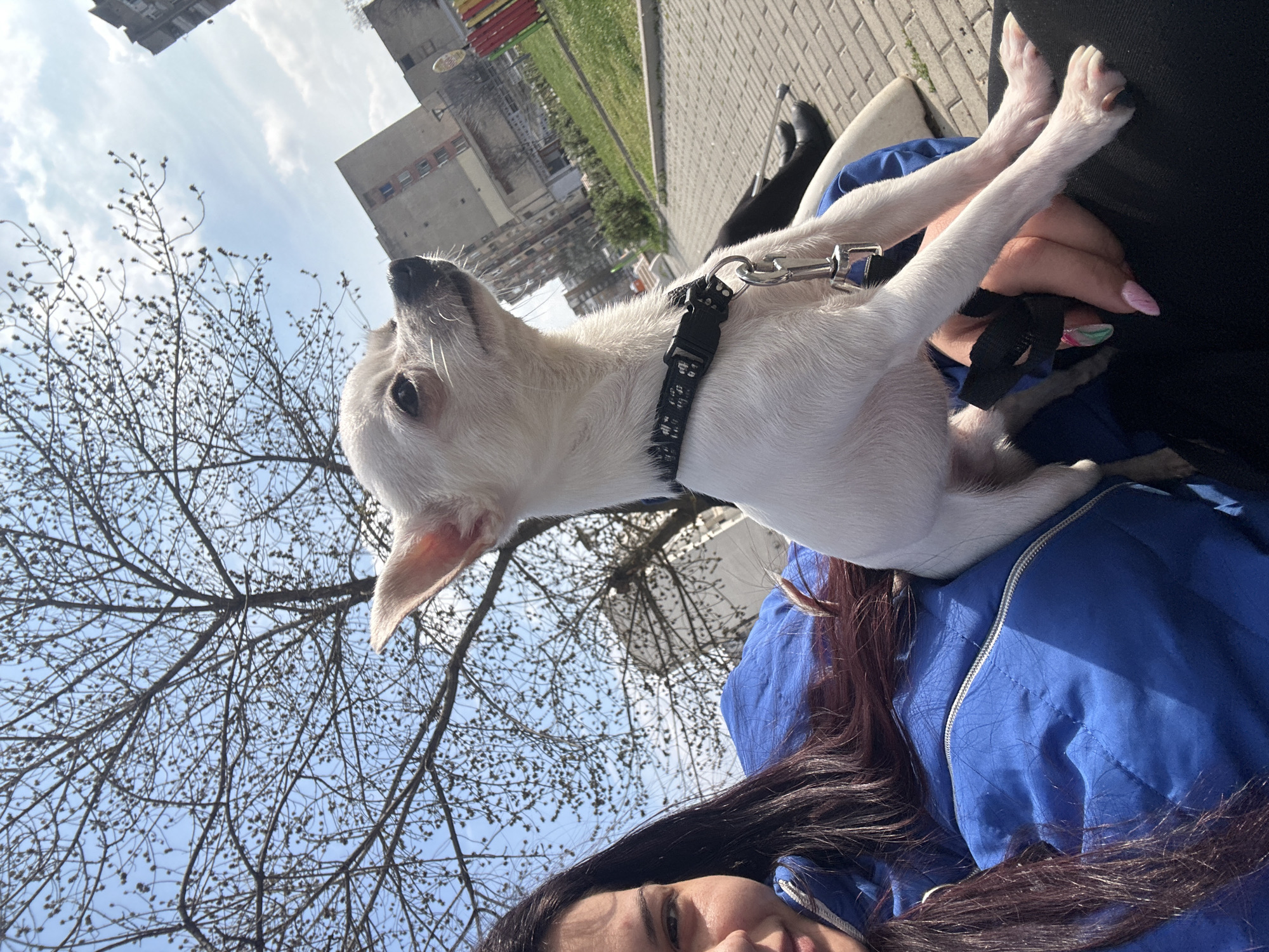 A low-angle shot shows a white chihuahua wearing a black harness perched on the lap of a person with long dark hair and a blue jacket. The dog is looking upwards. The person is holding the dog’s front paws. In the background, there is a cityscape with buildings and a bare tree. The location appears to be Sliven, Bulgaria.