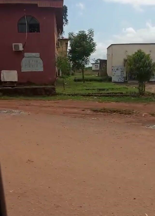 The video captures a view from inside a moving vehicle, showcasing a series of buildings along a dusty road