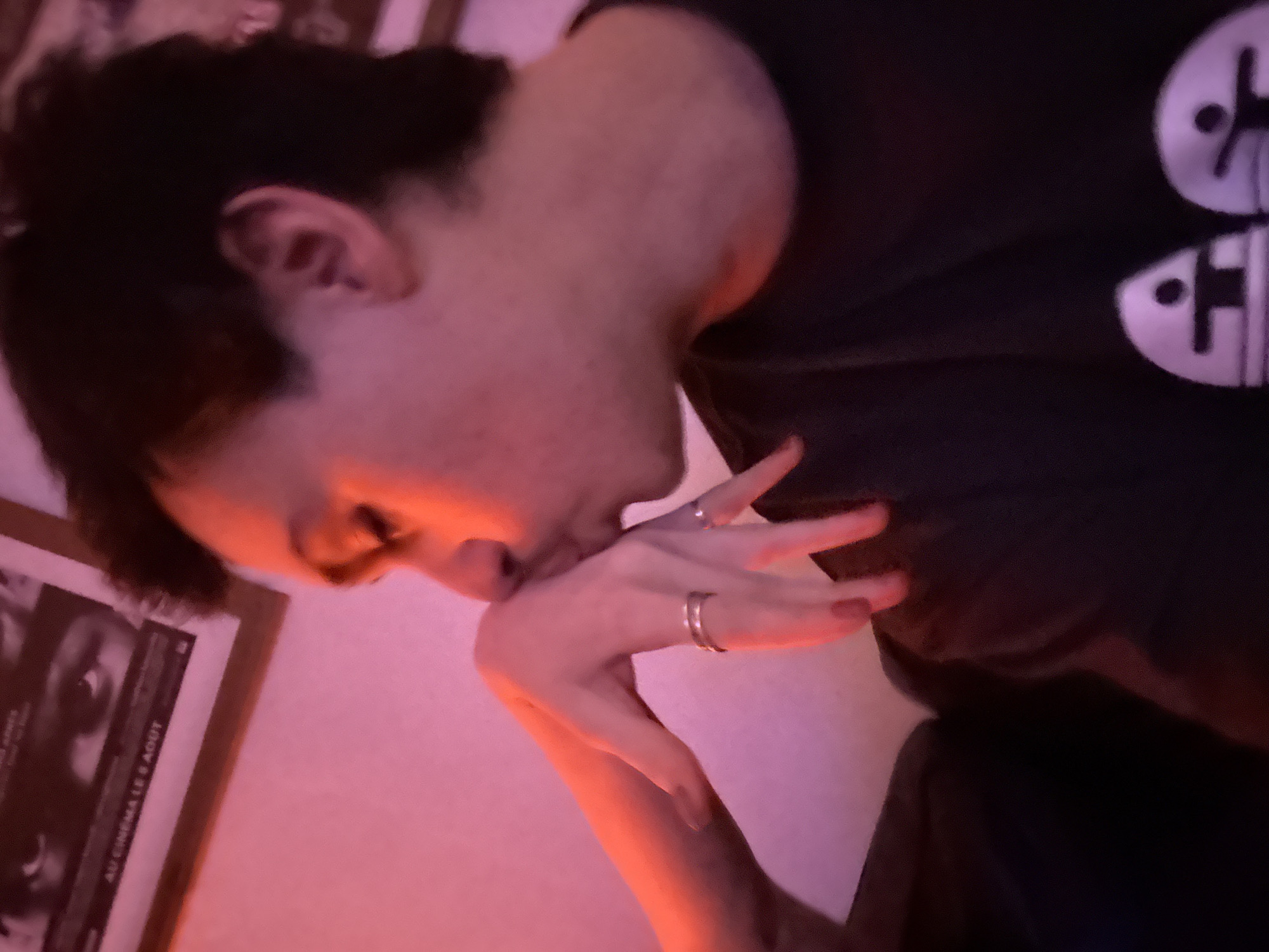 A person is lying down indoors with their head tilted towards the left of the frame. The person's left hand is raised and positioned near their face, with their fingers extended. They have rings on their fingers. They are wearing a dark-colored shirt with a white design on the right side. The background is softly lit with a pinkish hue, and a framed poster is partially visible on the left side of the frame. The location is indeterminable.