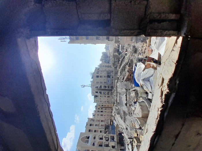 - "The image displays an extensively damaged urban landscape in Khan Yunis, Palestinian Territory, viewed through the concrete frame of a compromised structure" by FM-V8KrL2, licensed under CC BY 4.0